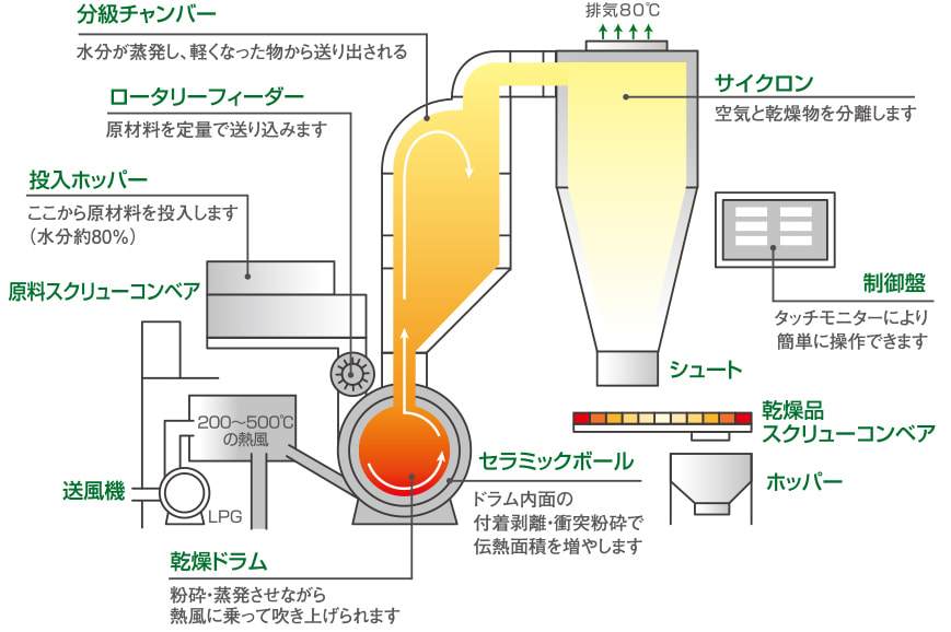ロータリーフィーダーより定量供給された原料(水分80%以下)は乾燥ドラム内で、熱風とセラミックボールによって攪拌されながら分級チャンバーに吹き上げられます。水分が蒸発して軽くなった乾燥品は分級チャンバーからサイクロンへ、水分が抜け切っていないものは再びドラムへと落ちます。乾燥品はサイクロンの下部より排出され、上部排気塔からは水蒸気が排出されます。